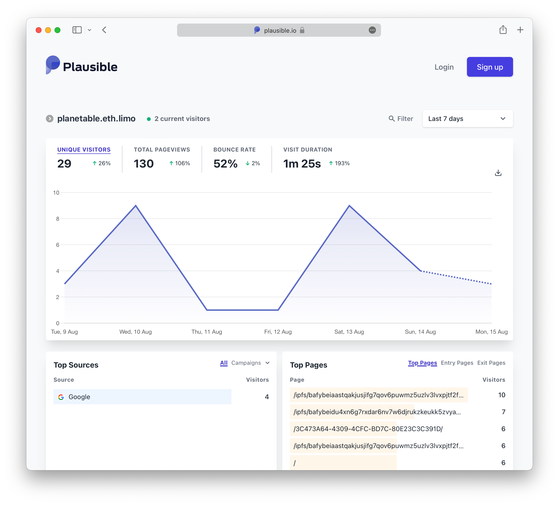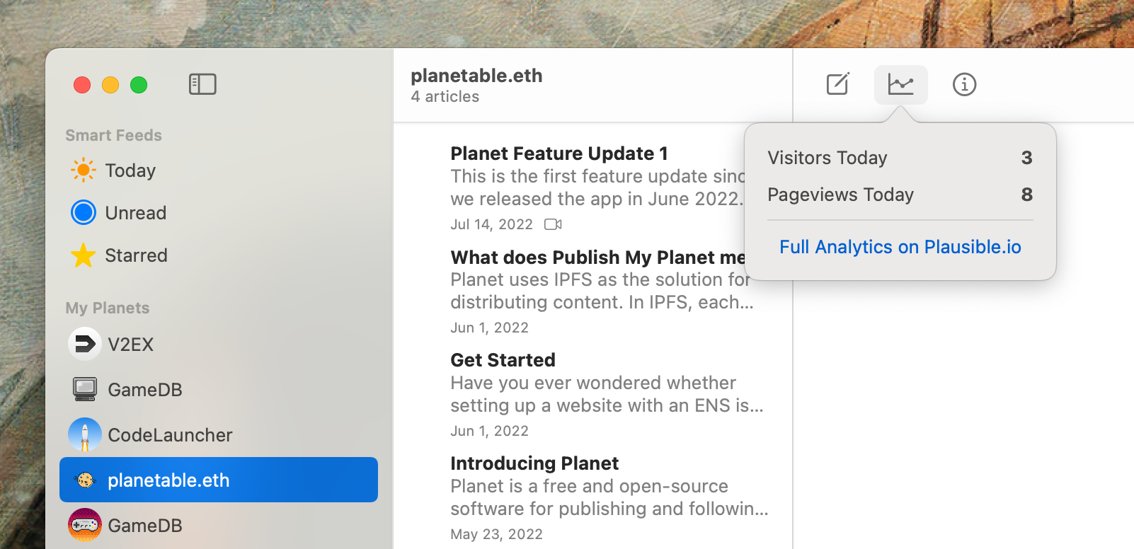 Plausible.io is an open source web traffic analytics platform. You can now enter your Plausible.io domain and API key in the info panel of Planet. And a new button will show you the traffic stats of your Planet.